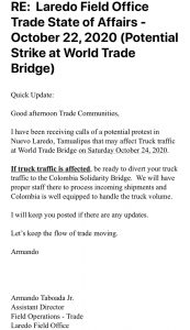 “If truck traffic is affected, be ready to divert your truck traffic to the Colombia Solidarity Bridge. We will have proper staff there to process incoming shipments and Colombia is well equipped to handle the truck volume”