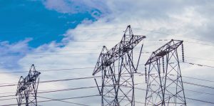 Powerlines and towers against blue sky