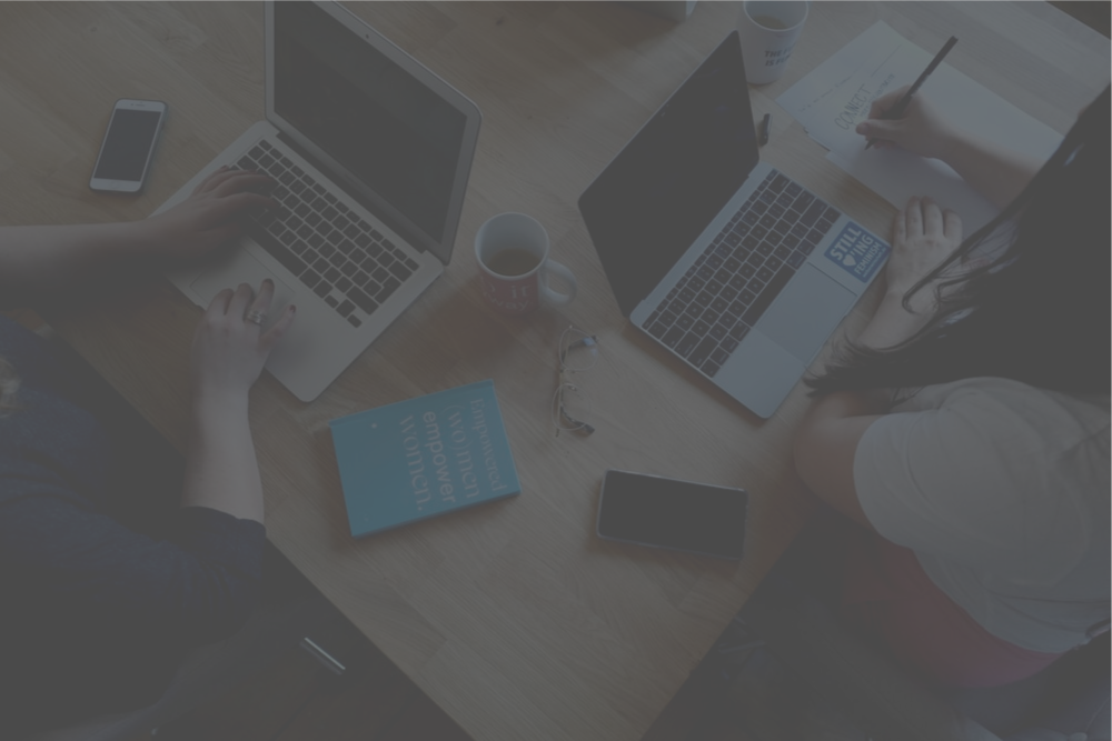 aerial shot of people at desk on laptops
