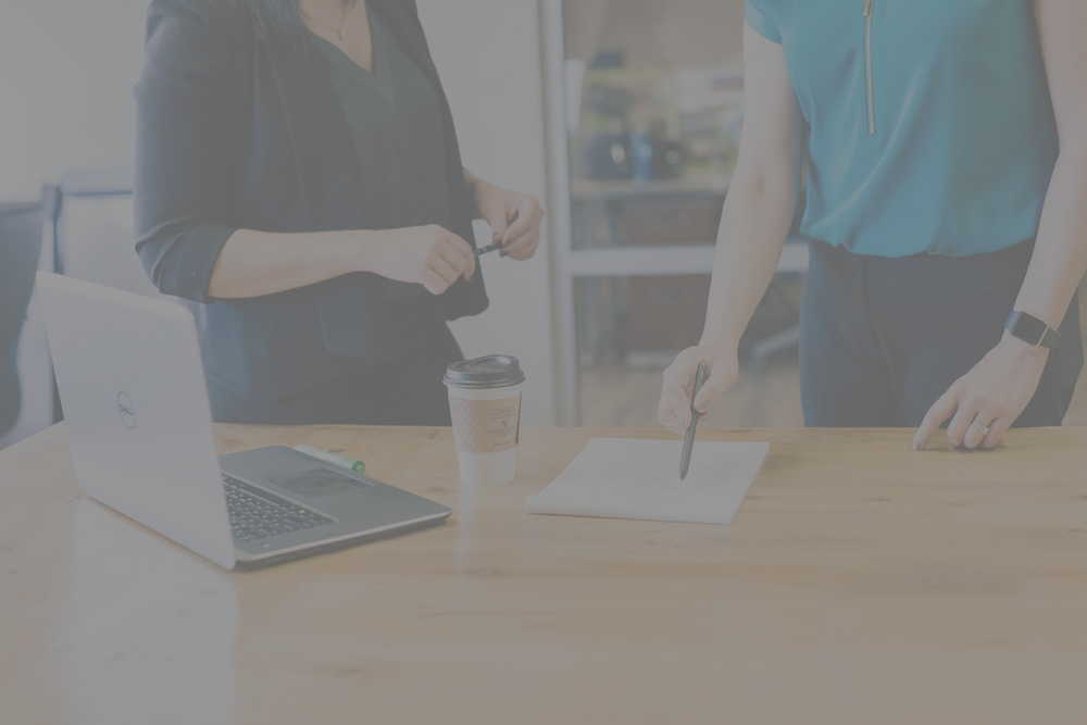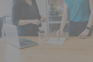 two women at desk looking at document and computer with coffee on desk